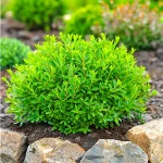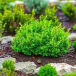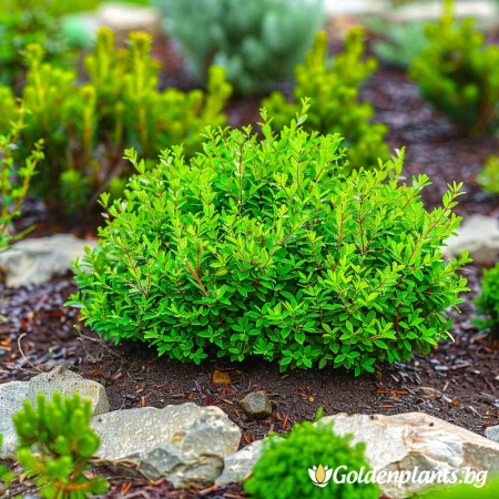 Вечнозелен, компактен храст с дребни, лъскави, наситено зелени листа, образуващ плътна, сферична форма. Отличава се с бавен растеж и изключителна устойчивост на студ и вятър. Подходящ е за скални кътове, бордюри и контейнери, като запазва декоративния си ефект през цялата година.